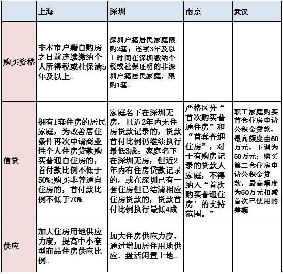 從四個城市出臺的樓市新政可以看出,大部分新政都是集中在買房門檻和信貸政策上面做文章。上海和深圳皆對本地的買房門檻提高了限制。上海非本市戶籍自購房之日前連續(xù)繳納個人所得稅或社保滿5年及以上;深圳戶籍居民家庭限購2套;連續(xù)3年及以上時間在深圳繳納個稅或社保證明的非深圳戶籍居民家庭,限購1套。