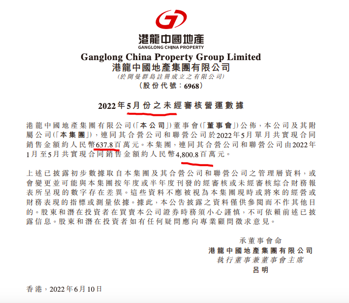 另,2022年1-5月份,港龍中國實(shí)現(xiàn)合同銷售金額約48元,按年同比下跌約66.1%。